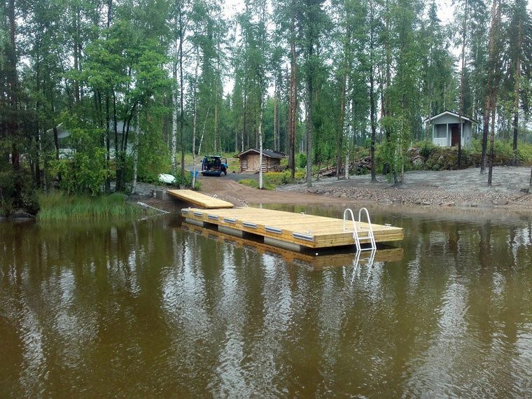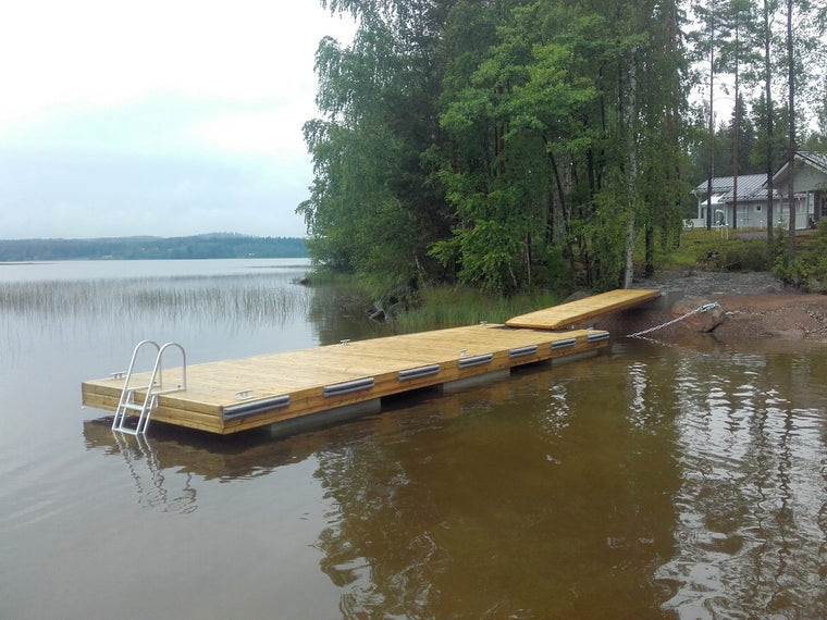 Tämä laiturimalli on erityisen tukeva jos verrataan betoniponttonilaiturimalliston kapeampiin 2,4 m malleihin. Tukevan tästä 3 m leveästä Timosta tekee kuusi laiturin kulmiin sijoitettua ponttonia jolloin kantavuus on nimenomaan laiturin reunoilla eikä keskekellä kuten 2,4 m leveissä malleissa. Jos et tarvitse ihan näin pitkää laituria tutustu myös Eero malliin.